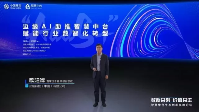 亚信科技首席技术官欧阳晔博士就《边缘 AI 助推智慧中台,赋能行业数智化转型》主题进行了分享。他表示,5G和边缘AI作为中国移动智慧中台技术体系的一组新型通用目的技术组合, 可将云端智能投送至边缘,赋能行业数智化转型。通过5G无处不在的连接能力,结合软硬一体化的边缘AI设备,智慧中台可将云端AI能力投送到千行百业的边缘应用场景,助力行业打造云边端协同的智能业务。未来,亚信科技将与中国移动持续提升边缘AI引领力,共同推进智慧中台AI能力的云边端协同演进与落地。