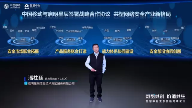 启明星辰首席战略官潘柱廷就《移启同行·护航智慧中台百千万行动》主题进行了分享。他表示,中国移动与启明星辰签署战略合作协议是双方强强联合,全力促进战略协同的一大突破。启明星辰通过将安全能力与智慧中台技术、业务发展方向匹配融合,加强在基础安全、业务安全、终端安全等五大方向的安全能力,既进一步完善了智慧中台的安全业务板块,也使成熟、优质的安全能力能够更快速、更准确、更智能地触达用户,实现为千行百业安全护航。