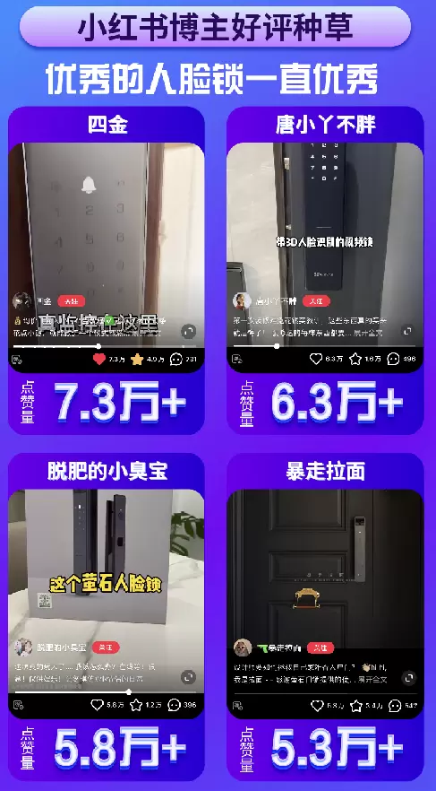 向来强调真实用户消费体验的小红书上有众多领域的网红达人KOL入驻,更像是朋友式的具备亲和力的推荐方式,可以实现粉丝的快速种草。@汪鱼喵喵、@四金、@暴走拉面等小红书博主采用体验分享、心得分享等软性植入的形式,对萤石极光系列人脸视频锁的优势亮点进行多维度的展示和讲解,视频收获大批粉丝点赞种草。在小红书平台,萤石智能锁品牌相关笔记互动量达到TOP2。
