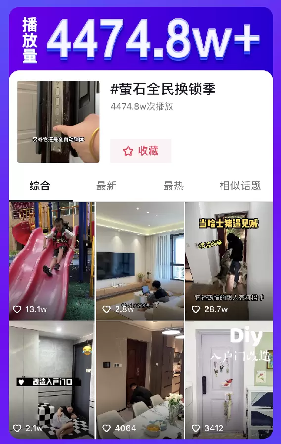 萤石网络携手抖音装修头部博主@红锅在工地,科技头部博主@安森垚等,拍摄面向特定人群/场景的智能锁体验视频,并自然的将需求痛点融入其中。通过带入#告别指纹痛苦#、#萤石智能锁#、#人脸大屏换锁一步到位#等话题,精准吸引到渴望便捷生活的目标人群,实现种草转化。