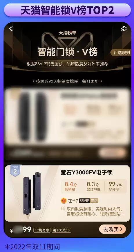 优秀的产品力才能承接用户的“种草”。萤石Y3000FV极光人脸视频锁曾在今年双11期间,入选了天猫智能门锁V榜TOP2。该榜单根据88VIP销售金额,品牌热度及好评率推荐,按照近90天畅销度排序,可见其产品力足够强大,萤石极光系列人脸视频锁可以说是用户们的放心之选了。