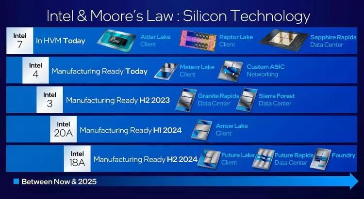 Kelleher还介绍了英特尔的最新制程路线图,将其与摩尔定律的推进以及自晶体管发明以来的器件的演进联系起来。Kelleher表示,自英特尔在不到两年前公布新的制程路线图开始,一切都在步入正轨。同时,她也补充了一些细节,比如哪些处理器将率先采用新技术。