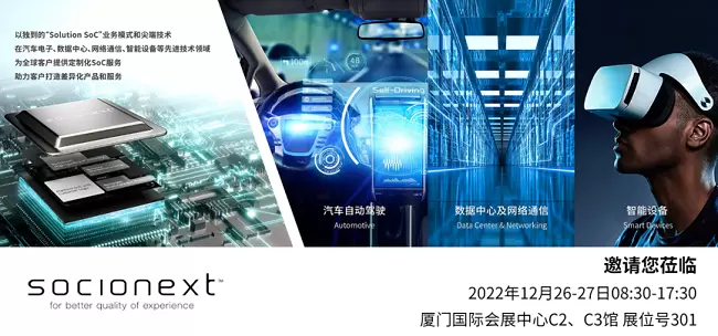 中国上海,2022年12月14日---SoC设计与应用技术领导厂商Socionext Inc.(以下“Socionext”)将携多项领先技术解决方案亮相在厦门举办的中国集成电路设计业2022年会暨厦门集成电路产业创新发展高峰论坛(ICCAD 2022)。