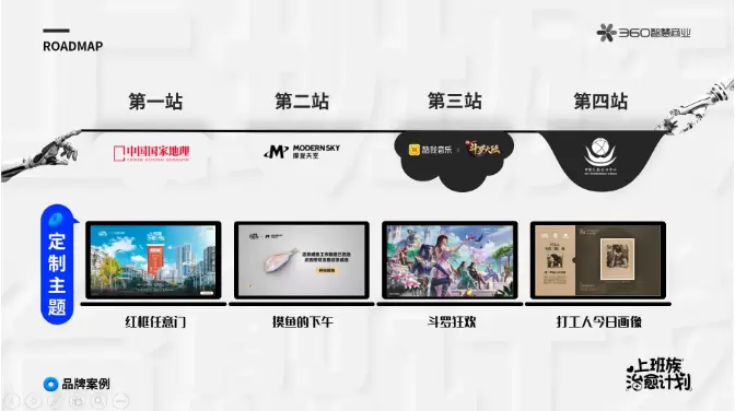 在四站治愈之旅中,360结合中国国家地理的品牌LOGO,以红框任意门H5为创意,通过风景美图与走心文案,唤醒大众对于美景的向往。在与摩登天空的合作中,为音乐直播栏目《摸鱼的下午》定制同名交互画报,点击画报便可让咸鱼被治愈。在新斗罗大陆手游与酷我音乐的联动中,聚焦IP打造动态壁纸,在办公场景中建立情感纽带,官微联动配合全渠道扩散引发用户破圈扩散。在和中国文物交流中心的合作中,打造《打工人今日画像》线上展览,工作时间精准推进,波动“打工人”的心弦。同时,配合360PC锁屏画报、360导航等站内资源的强势曝光、社交平台与网络媒体的协同扩散,引发用户对品牌的价值认同,带来跨场域、跨圈层的精神共振。
