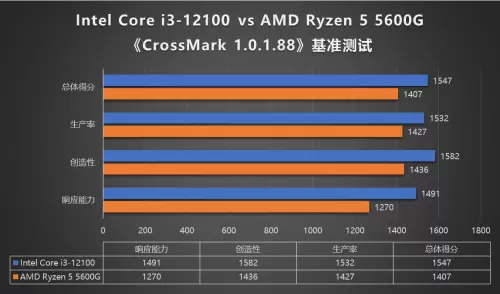 收集了测试结果,可以发现,酷睿i3-12100对比锐龙5 5600G,在总体得分方面有大约10%的领先幅度,同时在生产率、创造性和响应能力三个子项目方面,也都做到了全面优势。