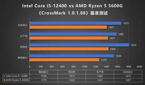 在核心数量和睿频都与锐龙5 5600G完全相同的情况下,微架构效率成为了影响性能的关键因素。而从汇总的数据结果上来看,酷睿i5-12400在CrossMark生产率、创造性和响应能力三个子项目中均获得了完胜,总体得分领先超过18%,这直接体现了Golden Cove与Zen 3的IPC效率差距。