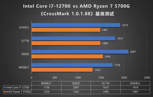 从核心数量以及加速频率来看,锐龙7 5700G显然就不是酷睿i7-12700H的对手,再考虑到Golden Cove与Zen 3两个微架构之间的IPC差距。最终我们汇总测试数据发现,酷睿i7-12700运行CrossMark做到了完胜锐龙7 5700G,总体得分领先有29%;而在差距最大的创造性子项目中,领先更是超过35%,从数据结果来看,可以说两颗处理器的性能差距还是比较大的。