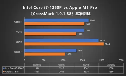 恰好CrossMark也有针对MacOS的版本,中国计量科学研究院也分别测试了搭载M1 Pro的Macbook Pro和搭载酷睿i7-1260P的Lenovo Thinkpad X1 G10。其中酷睿i7-1260P是第12代酷睿P系列处理器的高端型号,提供4个P-Core+8个E-Core,最高睿频4.7GHz,共计18MB三级缓存;M1 Pro则由8颗高性能核心和2颗高效率核心组成,配备16核心GPU,以及最大32GB高速统一内存。