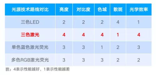 但其缺点在于LED光源很难突破2000ANSI流明天花板,画质表现上也很难再有突破,越来越无法给予用户更多的期待。因此当前亟需一项能够取代LED的光源,而商用级高端投影仪、以及电影院激光厅采用的三色激光就是那个可以取代LED的光源。