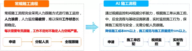 通过AI赋能的智慧机房运维能力,可实现各项运维工作,以视频代替人工随工,提升机房运维效果,降低运维随工人员成本80%以上,同时实现工单与机房基础设施联动,从施工前、中、后提升机房运维质量与安全。
