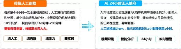 机房环境上,借助AI手段,通过告警时推送的图片信息和摄像头位置信息,帮助巡检人员迅速定位安全事件发生位置。结合对闯入、烟感、雾感、温感等,可以实现7*24小时无人值守,每日人工巡检次数减少50%,单次巡检耗时从3小时降低至1小时。