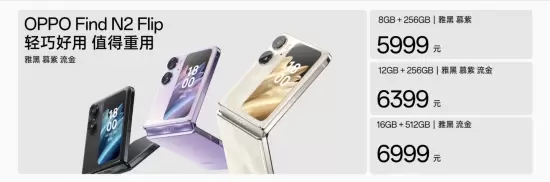 OPPO Find N2 Flip拥有雅黑、慕紫、流金3种配色,8+256GB售价5999元,12+256GB售价6399元,16+512GB售价6999元。