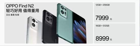 OPPO Find N2 拥有云白、松绿、素黑(素皮) 3种配色,12+256GB售价7999元,16+512GB售价8999元。