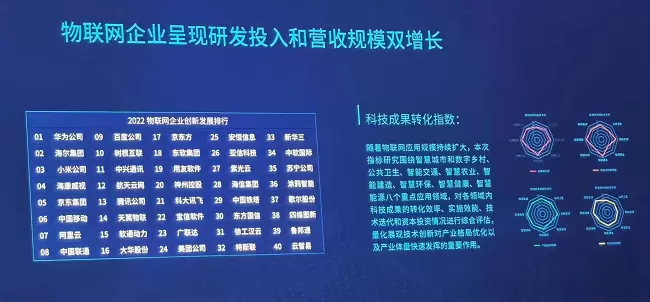 在连续多年三新成果评选的基础上,今年物博会还创新推出了首个物联网产业创新指数成果,量化展现物联网在推动数字经济发展、赋能传统产业转型升级方面的重要作用。据现场发布的2022物联网创新发展排行榜,树根互联、华为公司等入选TOP10,呈现研发投入和营收规模双增长。