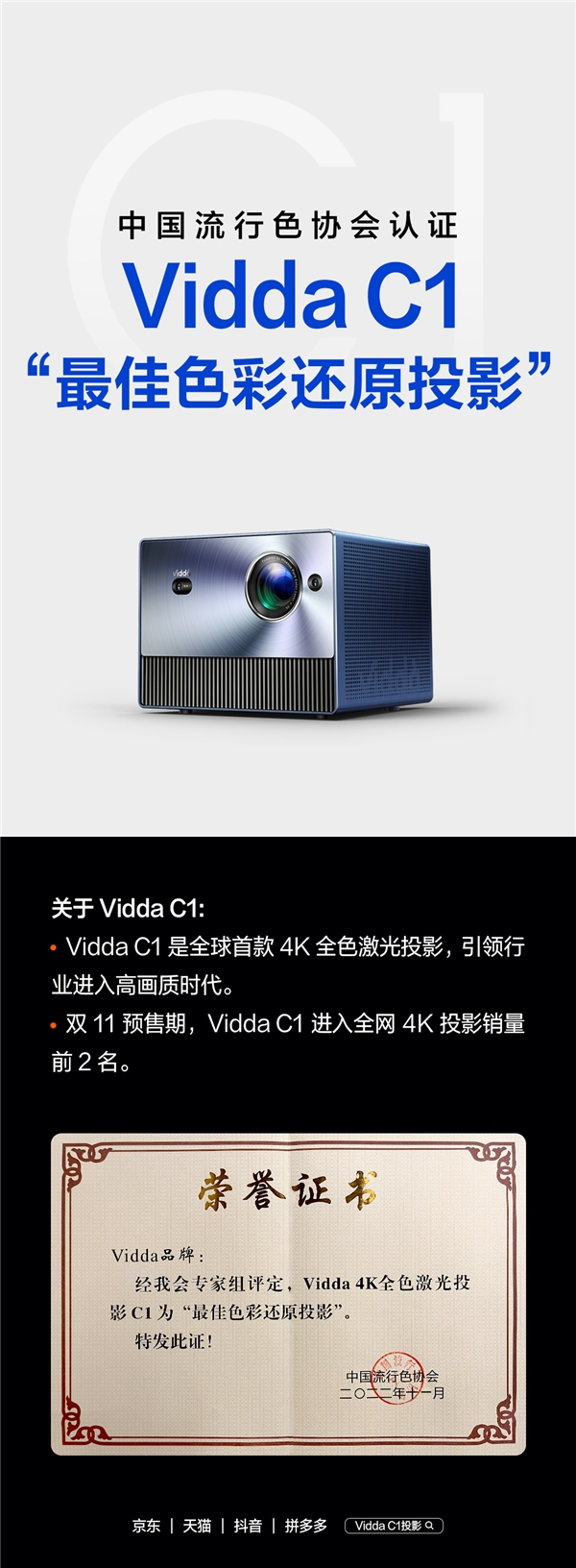 更专业的三色激光投影 Vidda C1获官方认证最佳色彩还原投影
