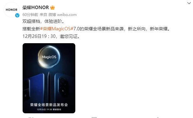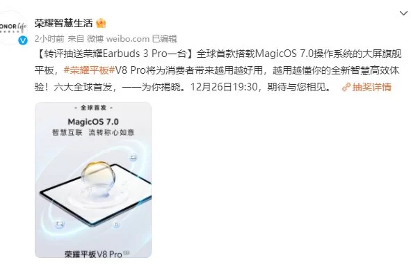 12月19日,荣耀官方发布了有关双超新品的悬念海报,正式确认了12月26日将举办本年度最后一场荣耀全场景新品发布会,推出双超搭档:荣耀80GT手机与荣耀平板V8 Pro。荣耀平板V8 Pro定位“大屏实力派,超级工作台”,并将成为全球首款搭载MagicOS 7.0的平板产品。围绕年轻人对平板生产力的升级需求,荣耀平板V8 Pro集高效生产力和影音体验于一体,全面进化的高效生产力非常值得期待。