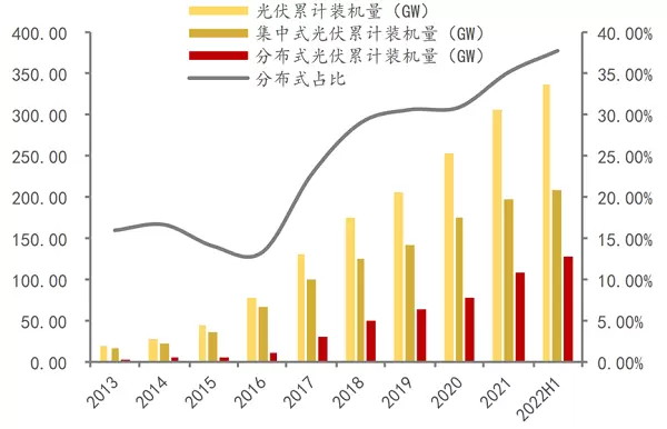 相对于集中式项目受限于土地、林地等资源,分布式光伏的布局更为灵活。据中国光伏行业协会数据显示,今年前三季度,分布式新增装机35.33GW,占总新增装机的67.2%。截至9月底,分布式光伏累计装机量约142.43GW,占光伏累计总装机的39.8%。