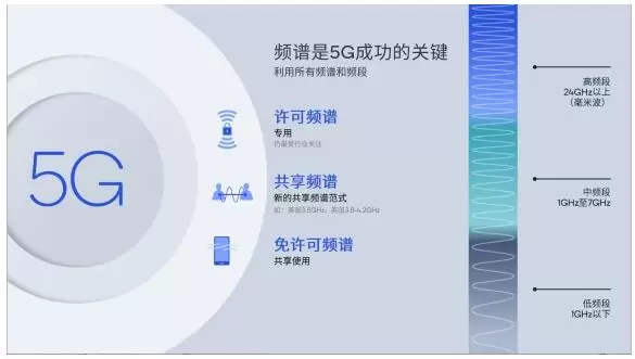 频谱是推动5G演进、实现5G成功部署的关键。与前几代移动通信技术不同的是,5G从设计之初就覆盖了多样化的频谱,包括许可频谱、共享频谱以及免许可频谱。从目前全球频谱规划情况来看,5G频谱使用具有显著的多样化,包括中低频段与高频5G毫米波的互相配合和补充,中低频段支持更多、更广泛的覆盖,毫米波支持超高速率、更低时延。充分开发和利用各类频谱,发挥最大的效率和效益,能够全面释放5G潜能,从而实现5G的全部愿景。