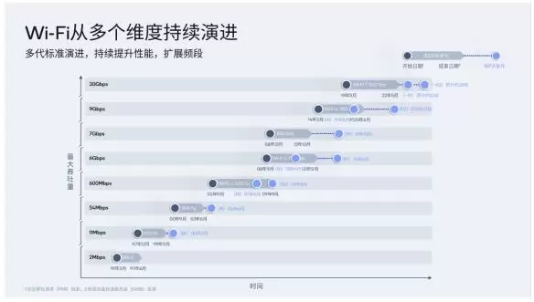 从1997年第一代标准颁布以来,每过三到六年,Wi-Fi技术就会演进至下一代,并带来性能的极大突破,其最大吞吐量从最初的2Mbps,增长至如今的Wi-Fi 7带来的超过30Gbps的速率。可用频谱的扩展一直稳健地推动着Wi-Fi技术创新,提供了更加丰富的频谱资源,通信效率更高,带来更强的性能、更大的吞吐量和更低的时延。