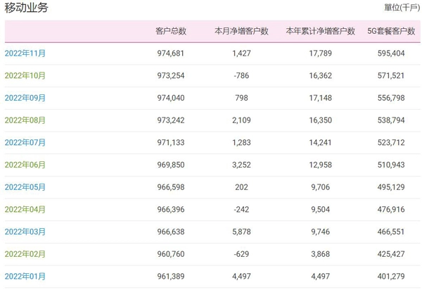 数据显示,2022年11月份,中国移动用户总数达到9.74681亿户,当月净增客户数142.7万户。有线宽带方面,中国移动有线宽带客户总数达到2.69943亿户,当月净增客户数226.1万户。