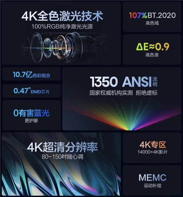 从投影仪的技术发展过程我们可以看出,最开始的投影机采用的都是灯泡光源,而后是LED光源,到近几年变成激光光源。而在激光显示领域拥有核心技术的海信,在激光的基础上研发出了三色激光光源,直接应用红、绿、蓝三基色激光器,显示效果大大提升,除了技术带来的高画质优势,Vidda C1还给到了4K分辨率,这在同级别中实属罕见,三色激光+4K组合,使得购买Vidda C1的用户在家就可以享受激光影院带来的震撼画质。
