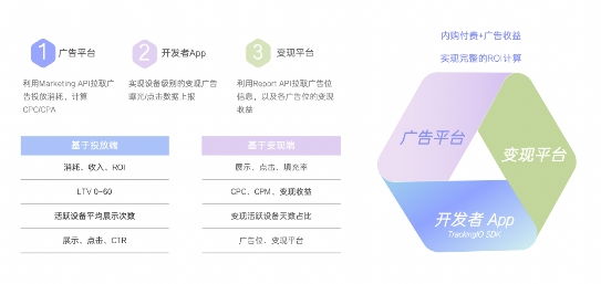 其次,TrackingIO对接了国内主流的广告投放平台以及变现平台,能够打通投放端和产品后端数据,实现一站式管理投放与变现数据,不用在各大媒体平台后台来回切换,轻松衡量各渠道买量用户的广告变现收益,有效提升投放效率。