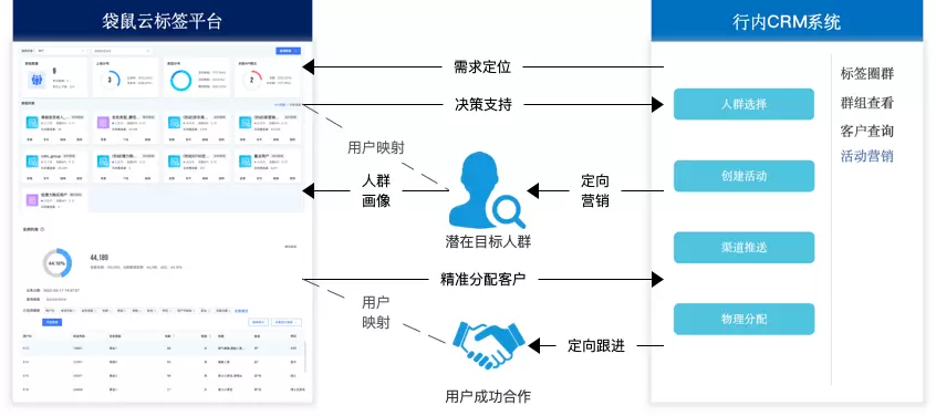 智能标签平台与行方CRM筛选器、营销活动实现集成,管户对管辖区域内的客户进行画像浏览及客群筛选后,通过智能标签平台将客户名单同步至CRM并由管户完成客户分配,客户经理在获取到分配的客户后可查询客户画像并进行客服营销服务。