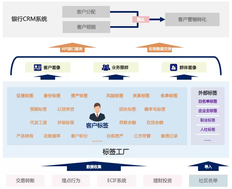 因此,为了将不同业务系统中的标签用起来,需要将各业务系统打通,对全行各类标签进行整合汇聚。
