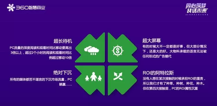 而对于PC来说,最适合做第四次接触的媒介——即用户在做出消费决策前的收口媒体。这是因为PC的超长待机和大屏幕都更加适合用户深度阅读和观看,建立品牌与用户间更加深入和有效的沟通。尤其在重决策的购买活动中,用户可以通过PC对品牌产生更深入的认知,从而做出购买决定,而在深入了解基础上产生的购买行为往往也意味着更少的售后问题。而PC的“绝对下沉”在意味着巨大的保有量的同时也保障了广告巨大曝光量,对于ROI的作用功不可没。