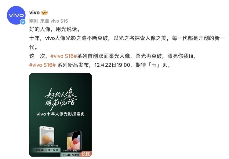 12月20日,vivo官方微博发布了vivo十年人像光影探索史的海报长图,回顾了vivo在十年人像光影探索史中的技术创新和经典产品。随后,vivo官方微博又发布了vivo S16系列人像功能海报,将vivo S16系列的前后置影像实力进一步展现。