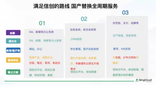 实践是检验真理的唯一标准,青云信创云产品目前已经贯穿了很多企业的办公系统、非实时核心系统、实时核心系统三步走过程,提供了国产替换全周期服务。