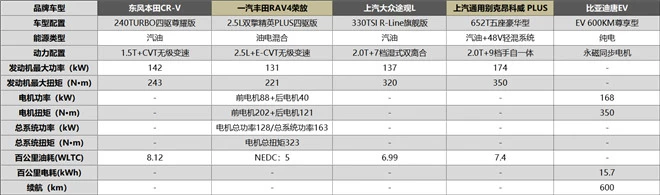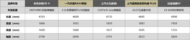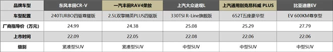 为便于直观的数据对比,本次入围车型均为2022年上市新车,东风本田CR-V选择售价为24.99万元的240TURBO四驱尊耀版(以下简称:东本CR-V)、一汽丰田RAV4荣放选择售价为24.38万元的2.5L双擎精英PLUS四驱版(以下简称:RAV4荣放)、上汽大众途观L选择售价为25.08万元的330TSI R-Line旗舰版(以下简称:途观L)、上汽通用别克昂科威PLUS选择售价为25.29万元的652T五座豪华型(以下简称:昂科威PLUS)、比亚迪唐EV选择售价为27.79万元的EV 600km尊享型(以下简称:唐EV)!