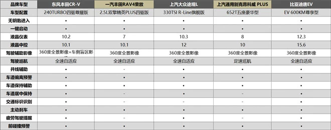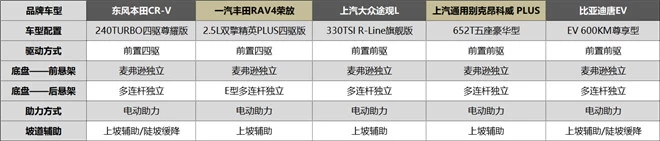 科技的进步,让用户对汽车的驾乘提出了更高的要求,不仅要开着舒心,还要乘坐舒适,让出行和旅途更有品质感。为此,东本CR-V、RAV4荣放、途观L、昂科威PLUS、唐EV均采用了舒适性更好的前麦弗逊+后多连杆独立悬架组合。同时,为了让驾驶更轻松,东本CR-V和唐EV还配备了上坡辅助功能、陡坡缓降,轻越野路况也能浅玩一下,而RAV4荣放、途观L和昂科威PLUS仅提供了上坡辅助。