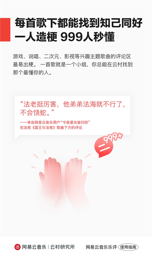 《报告》分别从“乐评变迁”、“乐评氛围”、“乐评玩法”三个方面对网易云音乐乐评进行了系统梳理,并得出了一些重要数据,如截止2022上半年,网易云音乐平台近半用户听歌的同时会看评论区,目前网易云音乐平台点赞量超过999的评论已累计数百万条等。通过这些研究内容和数据,印证了网易云音乐乐评作为一款社交产品、音乐衍生品和情绪产品,在用户端仍有着生生不息的生命力。