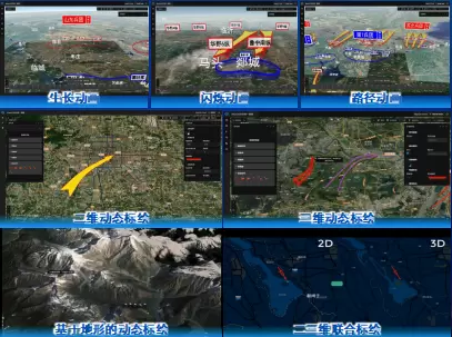 MapGIS 10.6全空间一张图产品新增了动态标绘系列组件,提供符号管理、资源加载、鼠标交互、脚本制作、态势推演、场景联动等多维度的二三维标绘资源一体化管理功能;支持二三维行业符号一体化管理,预置了常规图标、军事标绘、公安行业图标等资源,支持点、线、面、模型、标注等类型符号,并可采用SVG方式动态扩充符号资源;动态标绘支持二三维联合编辑与漫游,提供态势脚本制作和管理组件,可结合闪烁、显隐、属性、生长、比例、路径等多种态势推演动画,可按时间序列模拟态势演变过程。