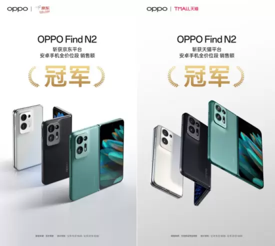 2022年12月23日,OPPO全新折叠旗舰Find N2今日10点正式开售,斩获京东、天猫平台安卓手机全价位段销售额冠军。