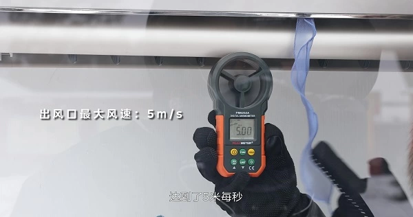 当然,能快速化霜和TA的制热量有着直接关系,所以我们打开房间继续测试了美的2P旋耀挂机出风口的风速,风速高达5m/s,站在空调前方能够感受到强劲的暖风,寒意感觉瞬间就被吹走了,的确舒适。