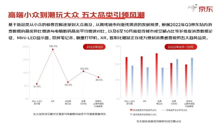 根据京东电脑数码推出的《2022中国潮电数码趋势洞见白皮书》可知,Mini-LED显示器、家用打印、XR(AR&VR)、客制化键鼠和双屏笔记本的成交额环比增速远高于电脑数码相关品类平均增速,成为2022年增长明显的五大趋势品类,引爆消费热潮。这五大品类在京东11.11期间取得了销售佳绩,其中家用大印量打印机更是实现成交额80%的同比增长,成为打印品类翘楚;Mini-LED显示器销量同比增长超20倍;双屏笔记本成交额同比增长120%;三模热插拔键盘成交额同比增长200%;XR设备,在京东11.11期间获得200%的亮眼增长,其中AR眼镜成交额环比增长10倍,这一亮眼的销售表现也展现出趋势品类的庞大发展市场。