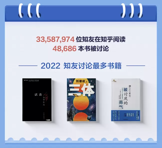 作为月活过亿的问答社区,2022年有超过3358万用户在知乎阅读,全年共发布了超过30万条与“书”相关的想法,共有4万8686本书被讨论,其中讨论最多的三本书分别是《三体》、《活着》和《被讨厌的勇气》。