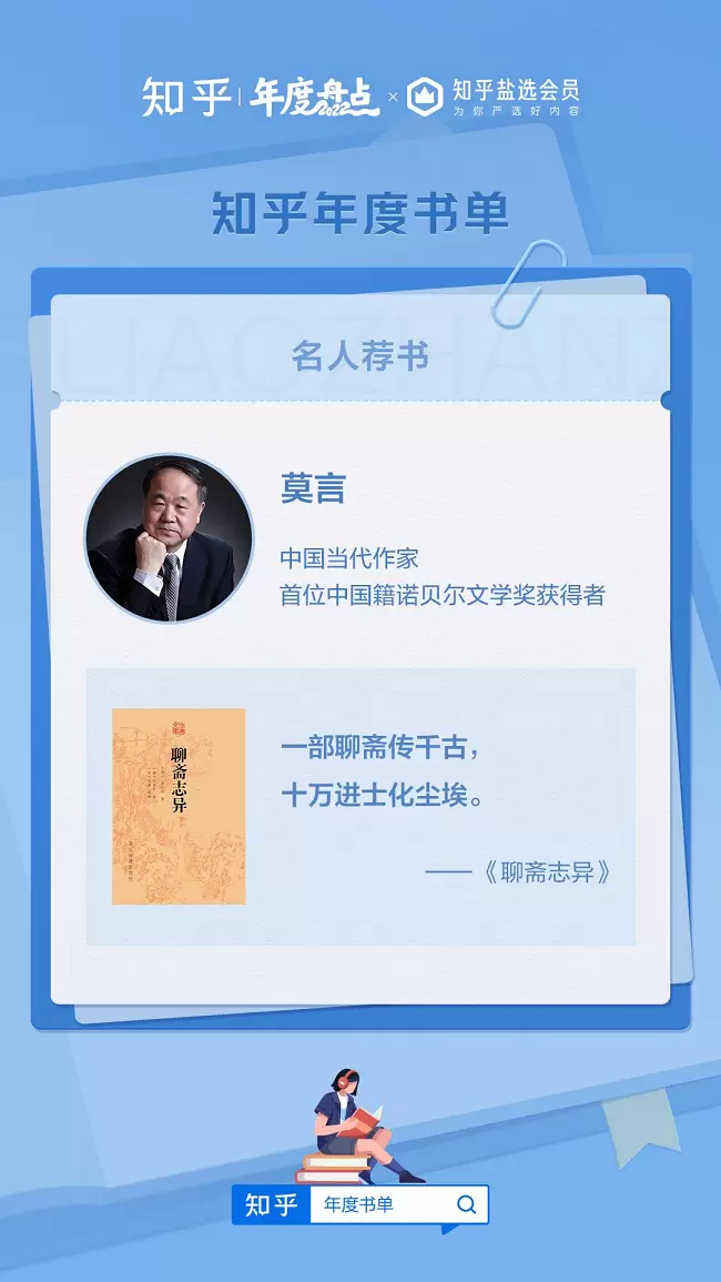知乎2022年度书单特别设置了“名人荐书”环节。莫言推荐了中国文学经典《聊斋志异》,并评语“一部聊斋传千古,十万进士化尘埃”。知名作家蔡崇达则推荐了加缪的存在主义神作《局外人》,在面向无常的当下,重读经典带来的力量。