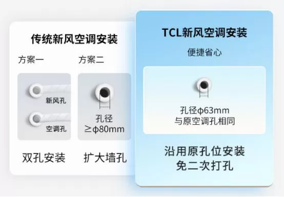 此外,TCL新风空调基于小蓝翼新风产品矩阵已带来两次技术革新。第一次革新是不用二次打墙孔或扩墙孔,可以输出30m³/h新风量。第二次革新是不用二次打墙孔或扩墙孔就获得60m³/h大新风量,且搭载了空气质量实时显示功能。不难看出,技术和产品的更新迭代是必要的,TCL新风空调满足了不同用户人群的多样需求,也体现出TCL新风空调始终贴心地立足于用户体验。
