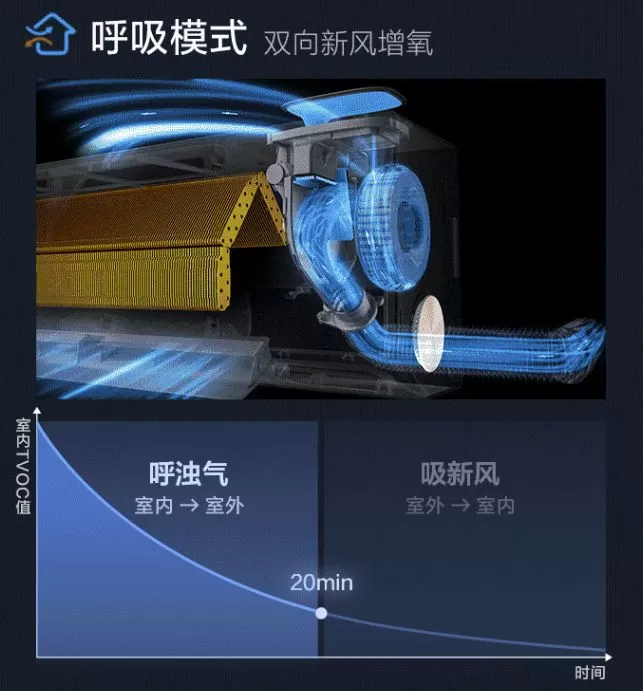 ③新风呼吸模式,空调会根据室内空气质量智能自动切换新风吸气与排气模式,双向焕新,不仅排出室内的湿气、异味,还能呼吸富氧的大量新风。