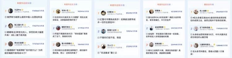 在众多头条用户的助力下,最终九边Pro、张之瀛大夫、李永乐老师获得新知榜前三名;非洲小五、耀阳环游记、意大利西蒙记获得生活榜前三名;红警08、陈翔六点半、万小刀获得娱乐榜前三名;资讯榜的前三名获奖者分别是是邱震海、金灿荣教授、终南剑客,而农人老肥、云飞和热尼娅、儿童骨科医生邱俏峰获得了限时创作榜的前三名。这些入选百大作品的创作者不仅可以获得百万流量曝光、年度作品荣誉和称号等权益,各赛道top3作品的创作者还将有机会直达2022今日头条生机大会现场,与众多行业大咖线下交流,分享彼此的创作心得和感悟。