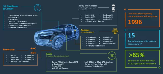 Arm IP广泛应用于汽车的各组成部分