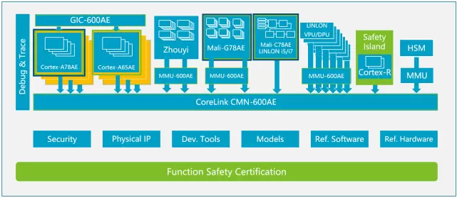 其中,安谋科技自研的“周易”NPU作为AI算力的核心计算单元, 算力高达320TOPS,并可通过并行架构扩展算力,完整、成熟的工具链和软硬件生态满足全场景整车智能计算需求,覆盖从智能座舱、ADAS到高等级自动驾驶的算力、性能指标需求;平台内置的主要计算单元Arm Cortex-A78AE CPU处理器,以及自研“星辰”STAR-MC2处理器符合ASIL-D功能安全标准,可提供强大的通用计算处理能力;在图像、视频数据处理方面,自研“玲珑”ISP能够为自动驾驶所需的数据感知提供保证,配合“玲珑”VPU的多重高清视频编解码器,以及Arm Mali-G78AE车规级GPU强大的2D、3D图形计算、渲染能力以及突出的硬件虚拟化特性,可以为更复杂的图像数据融合计算提供支持。