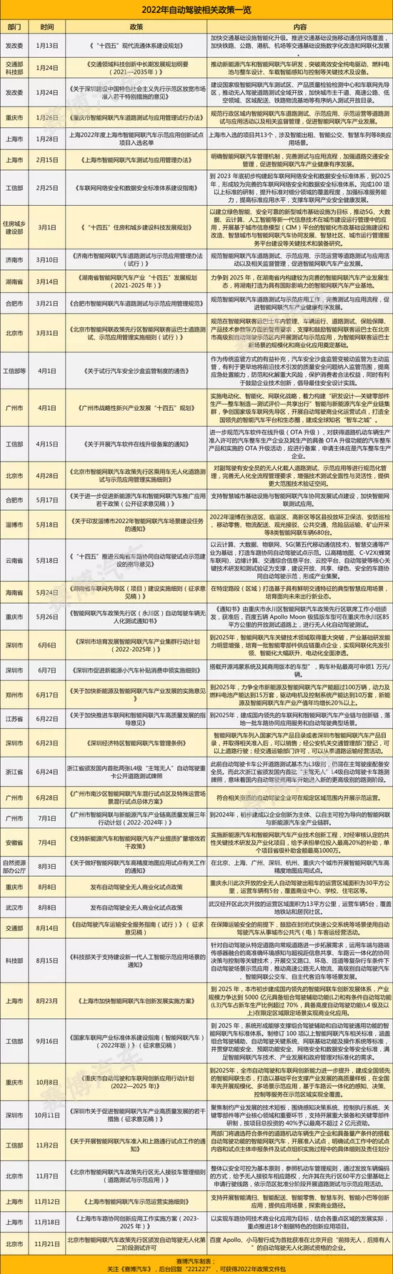 2022年,与自动驾驶相关赛道资本遇冷不同,政策层面则是在不断推动立法及相关标准制订工作,为更高阶自动驾驶大规模量产持续铺路。