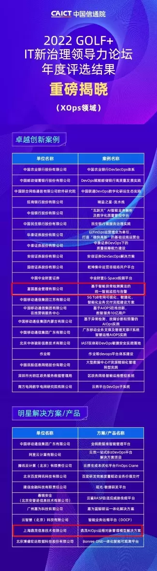近日,由中国信息通信研究院(以下简称:中国信通院)主办的“GOLF+IT新治理领导力论坛”年度评选活动结果发布。鼎茂科技为富国基金管理有限公司(以下简称:富国基金)实施部署的【基于智能异常检测算法的统一智能监控与告警】和鼎茂科技标准解决方案【AIOps运维对象管理模型解决方案】凭借卓越的产品力和优秀的用户体验,在一众产品中脱颖而出,分别成功入选“卓越创新案例”和“明星解决方案/产品”榜单。
