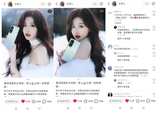 知名演员@孔雪儿 用荣耀80拍摄了一组冬日纯美大片。照片中,孔雪儿一袭白衣,站在初雪过后的长白山天池边,清纯动人;天池的水映射着比天更透彻的湛蓝色,与荣耀80的碧波微蓝配色浑然一体,在阳光的照耀下愈加闪耀。人、雪景、碧波微蓝彼此映衬,引发评论区粉丝纷纷点赞评论,互动量高达2.7万。