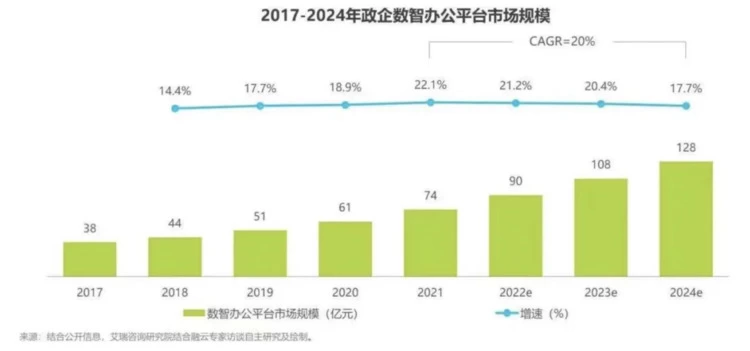 近期,融云与艾瑞咨询联合发布的《2022年中国政企数智办公平台行业研究报告》(下简称《报告》)显示,2021年数智办公平台市场规模已达74亿元,增速达22.1%。随着移动化办公渗透加深带来的第一轮建设和政企内部需求升级引导的第二轮建设,预计市场在未来3年将以20%的复合增速增长。