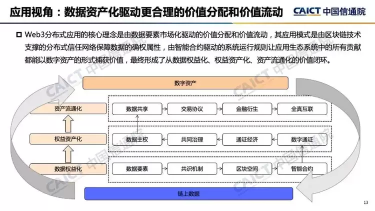 5. 在应用视角,Web3分布式应用的核心理念是由数据驱动的价值分配和价值流动。Web3应用的基本模式是由区块链技术支撑的分布式网络来保障数据的确权属性,由智能合约驱动自治的运行规则来让应用生态中的所有数据贡献都能以数字资产的形式捕获价值,并最终形成从数据权益化、权益资产化到资产流通化的价值闭环。